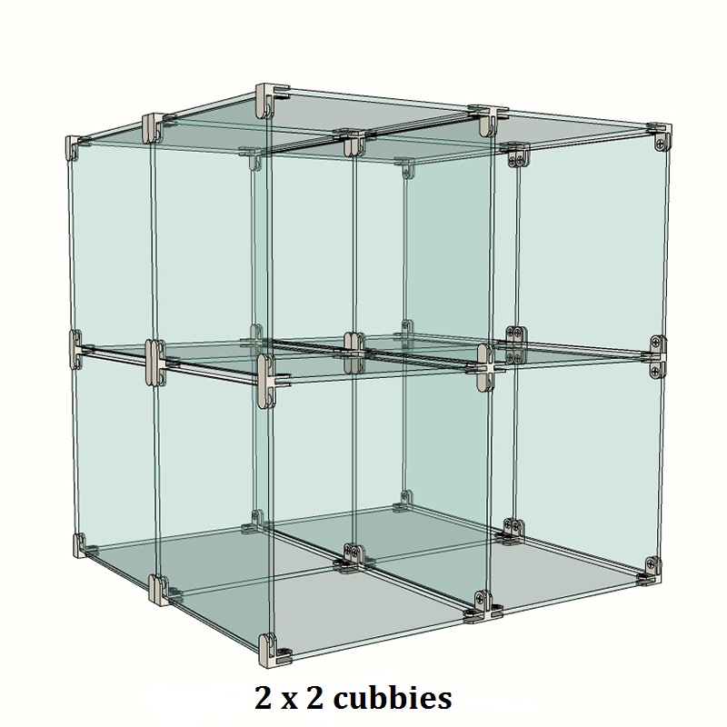 The glass cubbies can be arranged in various sizes and shapes, from a 3 cubby x 3 cubby merchandise display to a 5 cubby high x 6 cubby wide merchandise display and everything in between. The cubby displays have historically been created with or without the back glass partition in it depending on your needs.