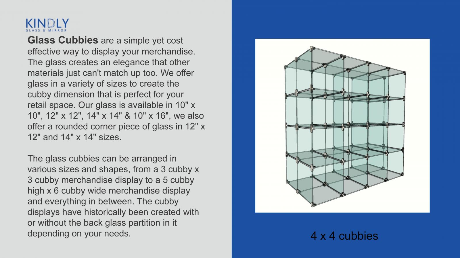 Glass Cubbies are a simple yet cost effective way to display your merchandise. The glass creates an elegance that other materials just can't match up too. We offer glass in a variety of sizes to create the cubby dimension that is perfect for your retail space. Our glass is available in 10" x 10", 12" x 12", 14" x 14" & 10" x 16", we also offer a rounded corner piece of glass in 12" x 12" and 14" x 14" sizes.